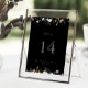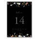 This wild multicolor floral black wedding table number is perfect for a rustic wedding. The design features watercolor pink, blush, purple, navy and white elegant flowers with emerald green leaves in a dark background.