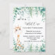 For baby's 1st birthday. A white background. a cute little baby giraffe and eucalyptus greenery and woodland ferns. Personalise and add the name and party details. Text: Wild One