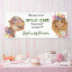 The cutest illustrations of a baby monkey peeking around the side of this banner and an equally cute baby lion cub looking at you have pretty floral head tiaras and are set against a stark white background that has black and forest green ext templates. These are ideal for a baby boy or girl baby shower or for a birthday party. Personalise the templates to suit your child's special occasion and wow your guests with this wall hanging suited to a safari, zoo, jungle or African adventure theme party.