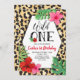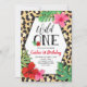 A fun, exotic first birthday invitation with a leopart print background and fun geometric frame. Invitation includes tropical leaves and red and pink hibiscus flowers with the phrase 'Wild One'.