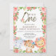 Celebrate your little girl's first birthday with this fun and cute safari-themed invitation, featuring watercolor pink flowers and adorable jungle animals (an elephant, a tiger and a lion).