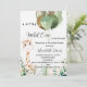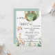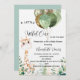 A white background. a cute little baby giraffe and eucalyptus greenery, woodland ferns and balloons. Personalise and add the name and party details. Text: A little Wild One is on the way.