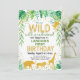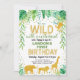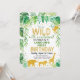 Green and gold Tropical Wild One Birthday Invitation Jungle Safari Animals with elephant, giraffe, monkey and lion.