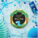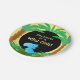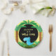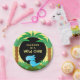 Features a cute little blue dinosaur standing in prehistoric palms and bushes. Matching invitations, paper napkins, stickers available in my stores. Design©2019 Rosalind Moore, Cherry Lane Designs.