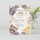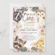 Celebrate your little girl's first birthday with this boho, soft-coloured invitation, featuring cute watercolor woodland animals (a skunk, a racoon, a deer and an owl) and boho, soft pink flowers.