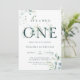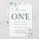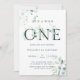 First Birthday invitation features painted watercolor eucalyptus and green leaves with botanical green letters. For more advanced customisation of this design, please click customise further link to change font, size, and colour.