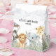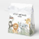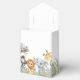 Present your thank-you gifts in style with this attractive Sweet Wild One favor box. The box features the full cast of watercolor safari and jungle animals, including the lion, elephant, and zebra, surrounded by lush tropical greenery. This design provides a beautiful, sweet, and practical way to package treats and keepsakes for your guests, perfectly fitting the theme of your boy baby shower. The finished box serves as a lovely keepsake itself.