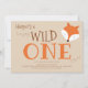 A Wild One fox first baby birthday invitation. This invitation is tan, orange, and brown with a cute fox face illustration on the side. Simply, customise this invitation, add it to your cart, and happy birthday to your wonderful baby!