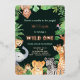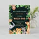 A fun and crazy jungle themed first Birthday invitation depicting a wild tropical jungle scene complete with a collection of cute wild creatures. This theme features wild animals and birds like elephant, cheetah, giraffe, zebra, monkey, toucan and ostrich framing the card in an amazing rain forest. The card features a unique custom 'Wild One' textured typography in real rose gold foil. Personalise the child's name also in rose gold foil. The background colour and text can be customised as per your requirement.