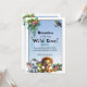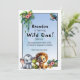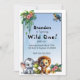 Our customisable Wild One jungle-themed birthday invitation brings together adorable baby animals - an elephant, turtle, lion, and a spring bird amidst blossoming flowers, promising an enchanting celebration. The card's main body proudly displays your child's name, with the phrase, "Is Turning A Wild One!"l