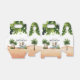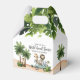 Bringing the jungle to life, this fun design includes a delightful group of safari animals: a friendly lion, a cheerful giraffe, a striped zebra, and a mischievous little monkey, all happily riding together in a teal blue safari jeep. A bold tiger sits proudly on a tree stump, adding to the excitement, while vibrant palm trees and lush green leaves complete the adventurous scene. The tropical elements and earthy tones make this favour box a great fit for any safari, jungle, or wild animal-themed first birthday party.