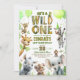 Wild One birthday invitations — unique, playful, and full of charm! This lively design features a joyful cast of celebrating animals: a cheerful little elephant, a flying zebra lifted by balloons, a jumping meerkat, a stylishly dressed giraffe, an adorable rhino, a cute tiger, a parrot perched on the letter “D,” and a diaper-wearing baby monkey. The soft pastel green and brown colour palette gives the invitation a modern, earthy feel that perfectly complements a "wild one" jungle safari-themed celebration. A fun and heartwarming choice for your little one's first birthday party!