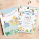 Cute first birthday invitation template featuring jungle safari animals, shrubs, exotic birds, and balloons in modern and trendy colours. Some of the illustrated animals include, a monkey, giraffe, lion, and a zebra. Easily add the party details by clicking the "Personalise" button.