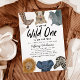 Cute Safari theme baby shower invitation template card featuring a hand drawn illustration of a giraffe, leopard, rhino, lion, elephant, and zebra. The text says "a little wild one is on the way." Perfect gender neutral invite.