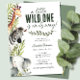 Welcome to the wild side with our Wild One Safari Animals Boy Baby Shower Invitation! If you're planning a safari-themed baby shower for a little boy, this invitation is perfect for you. Featuring playful illustrations of safari animals like an adorable elephant, zebra, and giraffe, against a backdrop of rustic green plants and wild tropical greenery leaves, it captures the adventurous spirit of the wilderness.