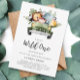 Easily personalise this beautifully styled wild one safari animal gender neutral invitation for your baby shower. The invitation features cute safari animals: lion, monkey, giraffe and elephant in a green car. The background is solid light green.