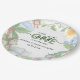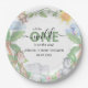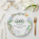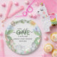 Baby shower paper plates featuring watercolor illustrations of a monkey, parrot, rhino and giraffe sitting amongst a green jungle background. The font styles, size and colour can be changed by clicking on the customise further link after personalising.