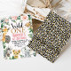Sweet wild one themed first birthday invitation for a girl featuring eight cute jungle animals, cheetah print balloon, foliage and pint roses.