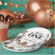 Wild one 1st birthday party paper plates featuring cute watercolor safari animals (giraffe, elephant, lion, zebra, leopard, monkey, bee eater bird), and a celebration template that is easy to customise.