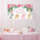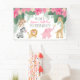 Celebrate your daughter's first birthday with this adorable safari birthday welcome sign! Sweet baby animals paired with tropical leaves, pink jungle flowers and pink and grey text are perfect for your daughter's first birthday. Text reads "Welcome to names WILD ONE FIRST BIRTHDAY PARTY. Text can be changed to your own wording. Featuring cute little monkey swinging on the vine, stripey zebra, cute lion, sprinkling elephant and curious giraffe. Easy to set the tone and style for a super fun "wild one" jungle or safari theme party!