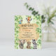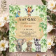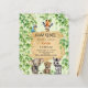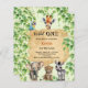 An invitation celebrating a boy's 1st birthday. A jungle, rainforest background with baby safari animals. Monkey, elephant, lion, Zebra, giraffe and a parrot. Personalise and add a name and party details.