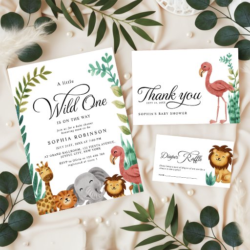 Celebrate the upcoming arrival of your little one with this Wild One Safari Jungle baby shower invitation. The design features adorable baby animals, including a lion, tiger, elephant, flamingo, and giraffe, with elegant calligraphy that reads “Wild One” at the top. Perfect for a boys’ jungle or safari-themed baby shower. Easy to customise with your party details. Available as printed invitations or digital downloads.