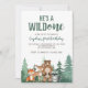 Wild One! Woodland Animal Birthday with bear, fox, deer, racoon and trees with woodgrain back.