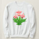 Sweatshirt in a digital illustration of a wild orchid plant, based on vintage botanical art, with flowers in shades of pastel to deep coral pink, and dark green leaves