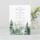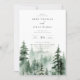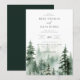 Elegant Watercolor Pine Tree Forest Scene, wedding invitation. Invitation features chic typography design style mix of calligraphy and bold type. Coordinating dark emerald forest green colour backing.