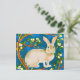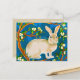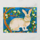 Postcard in an illustration of a wild rabbit, surrounded by flowering tree branches, against a dark denim blue background
