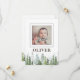 Rustic & vintage 2-sided birth announcement card featuring the name and photo of your new baby boy or girl using a white photo frame hand-painted pine trees in the background. The babies name, photo, birth record and parents name on the backside can be personalised to introduce your newborn to your friends and family.