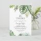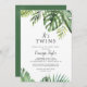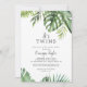 This wild tropical it's twins baby shower invitation card is perfect for a beach theme baby shower. The design features an exotic array of green watercolor banana palm tree leaves, ferns, foliage, botanical plants and greenery for a tropical summer feel.