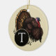 Customise this pretty, autumn themed design with a letter of your choice! An illustration of a wild turkey in the grass graces this monogrammed ornament. The monogram, in a classic serif font, is centred on a black circle beside the bird. It's perfect for thanksgiving! Makes a great gift for hunters and nature lovers, too.