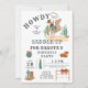 A "saddle up" cute and whimsical wild west boy's cowboy birthday invitation in terracotta browns and blues for a boy, with western gear cowboy gear and ranch animals. Saddle, steer, horses, cactus, saddle and lasso. Everything as cowboy needs. You can customise this for any age from 1 to around 8 years old, simply add the number in front of the word birthday. The back of the invite is a solid smoky grey blue to match the blue grey type on the front.