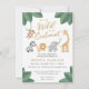 Celebrate the little one on the way with these adorable safari baby shower invitations! Sweet baby animals paired with tropical leaves and gold text are perfect for neutral baby showers. Text reads "We're wild with excitement!" Featuring cute little monkey swinging on the vine, stripey zebra, cute lion, sprinkling elephant and curious giraffe. Easy to add your own details for a super fun "wild one" jungle or safari theme shower!