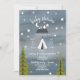 A baby shower invitation featuring a dark blue watercolor inspired background with white text surrounded by stars and illustrations of mountains with crescent moon, tipi, and evergreen trees. Personalise with details of your occasion.