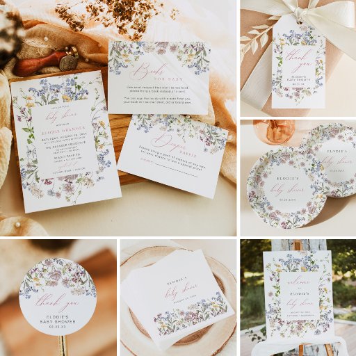 This wildflower themed paper plate features watercolor meadow flower graphics and a modern font. It is perfect for a baby in bloom themed baby shower and you can pair it with anything in the ELODIE collection for a cohesive look.