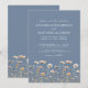 The background is a rich dusty blue or periwinkle on both sides, with the text in elegant dark gray fonts. Handwritten script blends with modern serif typography for a clean, contemporary feel. The muted floral palette complements a variety of wedding styles, from rustic outdoor gatherings to chic metropolitan events.