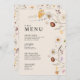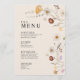 Wedding menu cards are chraacterised by boho style, floral artwork, and beige colours, with a mix of different font styles, often in different sizes, to create a unique, eclectic look that makes this menu's natural aesthetic.