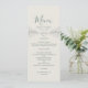 Elegant, boho, wildflower, botanical, sage green wedding menu with silver rope heart and vintage gilded floral lace.