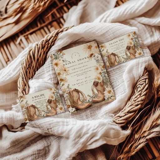 A soft, vintage Western design featuring cowgirl boots, wild daisies, and warm rustic tones. This aesthetic blends country charm with feminine florals, creating a cozy, down-to-earth style perfect for celebrating the bride-to-be. The gentle parchment texture, prairie blooms, and hand-drawn Western elements make this design ideal for anyone planning a warm, countryside-inspired celebration.