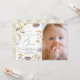 This elegant "little wildflower" girl's 1st birthday photo invitation features a white background with wildflowers in purple and yellow and butterflies. The reverse side features a light yellow background with floral patterns. Change the background colour and personalise for your needs. You can find more matching products at my store.