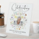 Modern memorial funeral pedestal sign features the wording 'Celebrating the Life of', your loved one's photo on a wildflower background, their name, and their birth/death dates. MATCHING items in our collection.