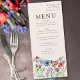 Wildflower wedding menu card with watercolor wild flowers. This rustic country botanical design has a pretty border of wildflowers including daisy poppy cornflower coneflower buttercup seedhead and clover. An elegant modern floral with bohemian garden theme. Please browse my store in the Wildflower Charm collection, for matching items.