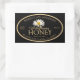 Personalise this honey label with your apiary name, location, and address. Elegant gold script font in the centre spells out "Wildflower" (edit this with your preferred honey type). White daisy photo on a black background with a double gold border. Use our included chart for your honey jar pre-calculated metric and standard weight conversions.