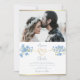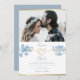 Boho, modern, elegant periwinkle wildflower dusty blue wedding invitation with modern calligraphy script, gold rope heart and photo.