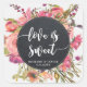 A beautiful love is sweet sticker with a watercolour pink wildflowers/floral design, set on a light grey background with chalkboard effect circle insert and brush lettering "love is sweet". Easy to change or delete the text field available to suit your personal requirements. Perfect for spring and summer weddings and showers. Lots of matching items in this boho collection. Visit my shop to see the full range.