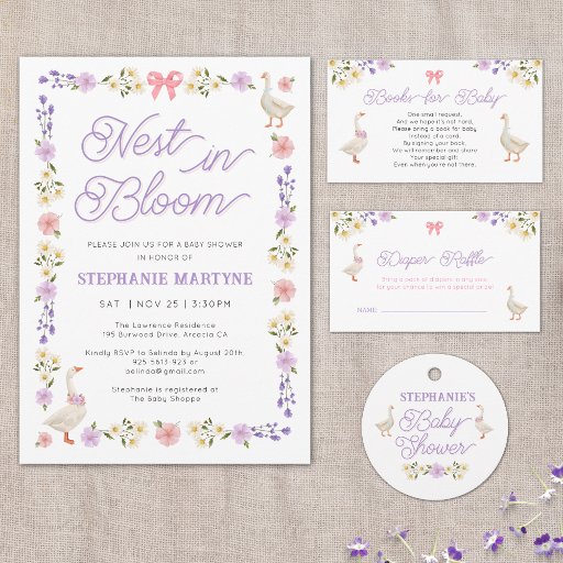 This baby shower sign features a cute whimsical design with wildflowers, daisies, lavender, pink bow and geese. Matching products available.