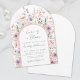 This version features an arch-cut shape with a soft white arch in the centre, bordered by a delicate pink outline for a charming and polished detail. Behind the arch, a lush watercolor arrangement of wildflowers and greenery creates a dreamy garden-inspired backdrop.