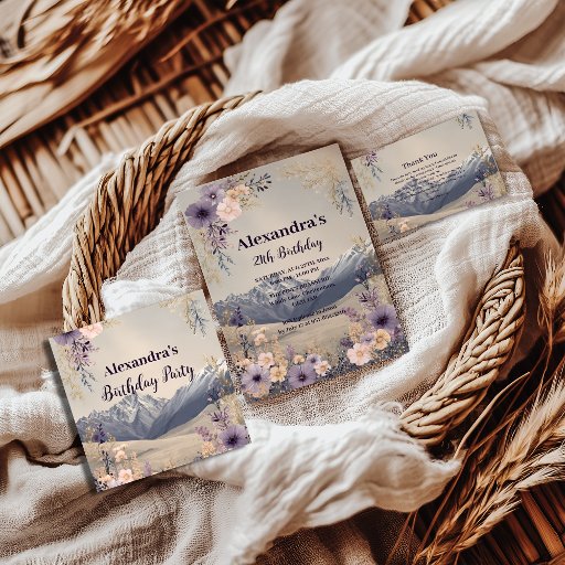 A romantic mountain-inspired design framed by soft wildflowers and gentle alpine scenery. Delicate florals in lavender, blush, and cream blend with a serene mountain backdrop, creating a timeless and elegant look. Perfect for nature lovers who want a refined, floral aesthetic with a calm, outdoorsy feel and a touch of vintage charm.